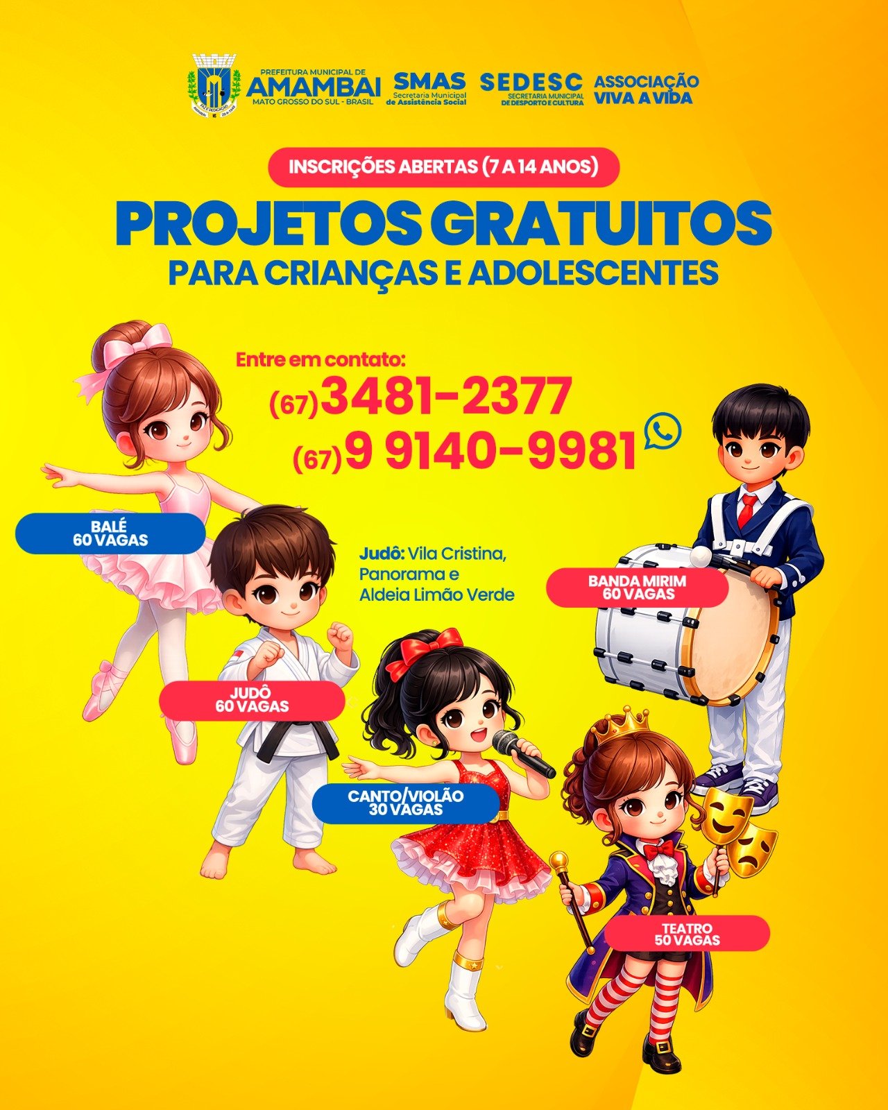 Secretarias municipais e associação abrem inscrições para capacitações em balé, judô, banda mirim, teatro e canto/violão com foco em inclusão social