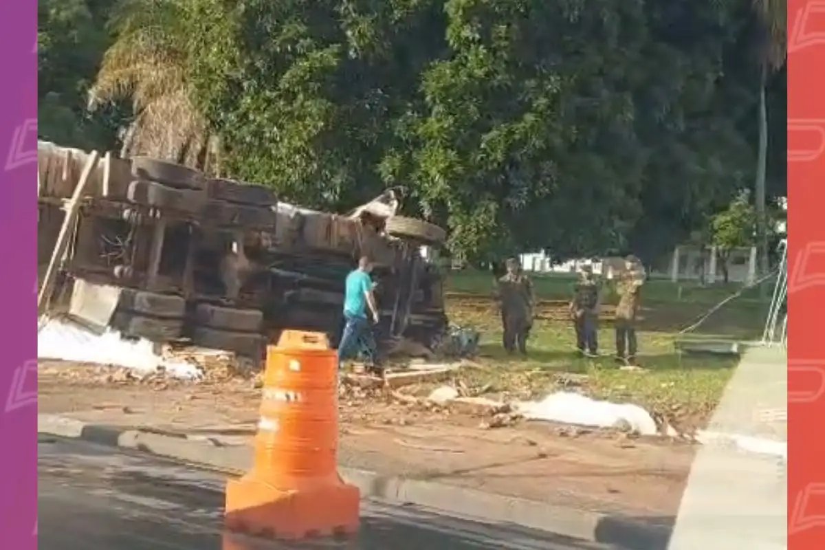 Um caminhão tombou na tarde deste sábado (31), após atingir um semáforo e o muro do 9º Batalhão de Engenharia de Construção, na Avenida Fernando