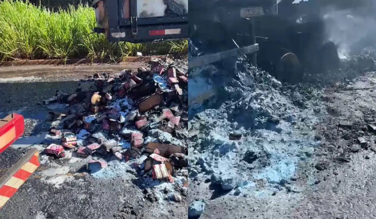 Um incêndio de grandes proporções atingiu uma carreta carregada com sabão em pó e sabonetes na madrugada desta quarta-feira (7) na rodovia MS-040, no município