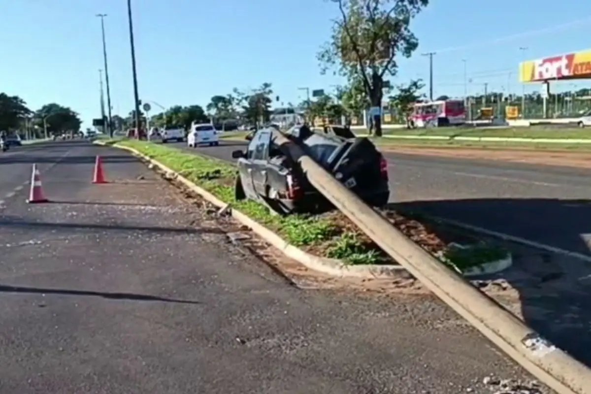 Um veículo ficou completamente destruído após atingir um poste da rede elétrica na avenida Gury Marques, em Campo Grande. Conforme a PM (Polícia Militar), o