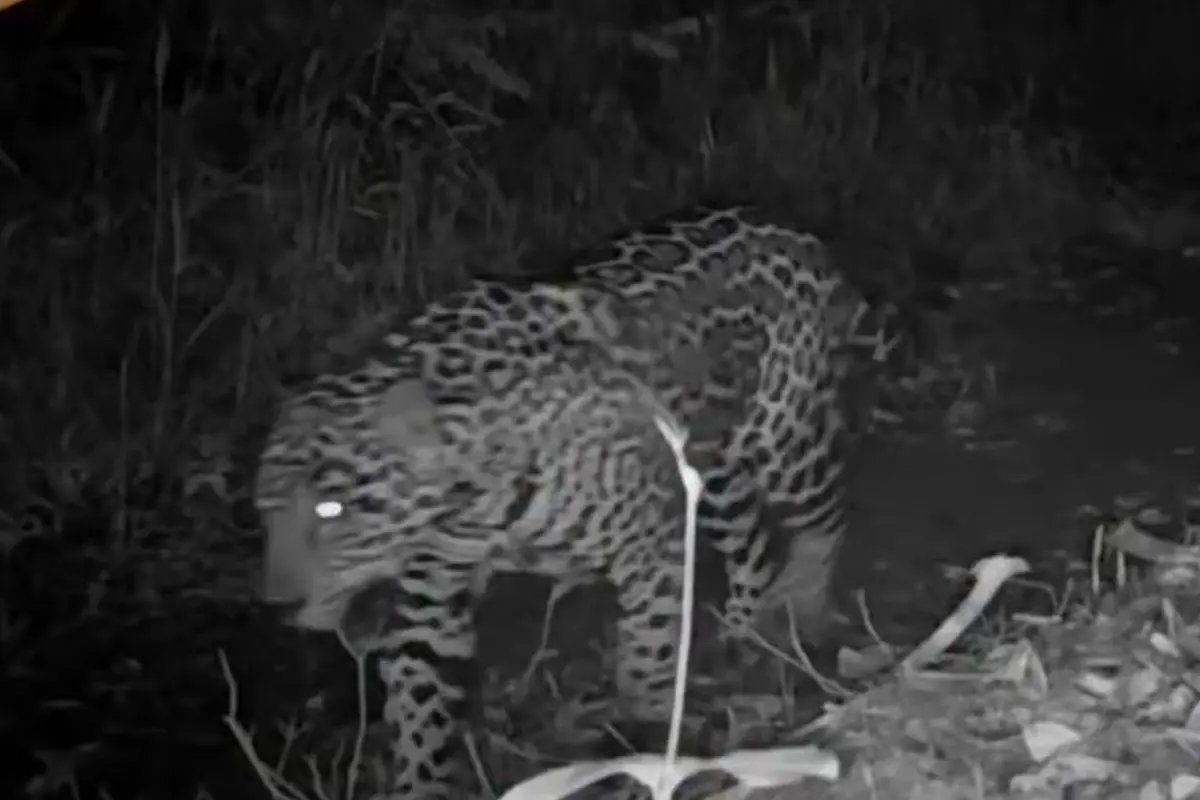 Uma câmera escondida registrou a onça-pintada Corixo caminhando por uma área alagada no Pantanal. O vídeo, divulgado pelo Sesc Pantanal, mostra o felino em um