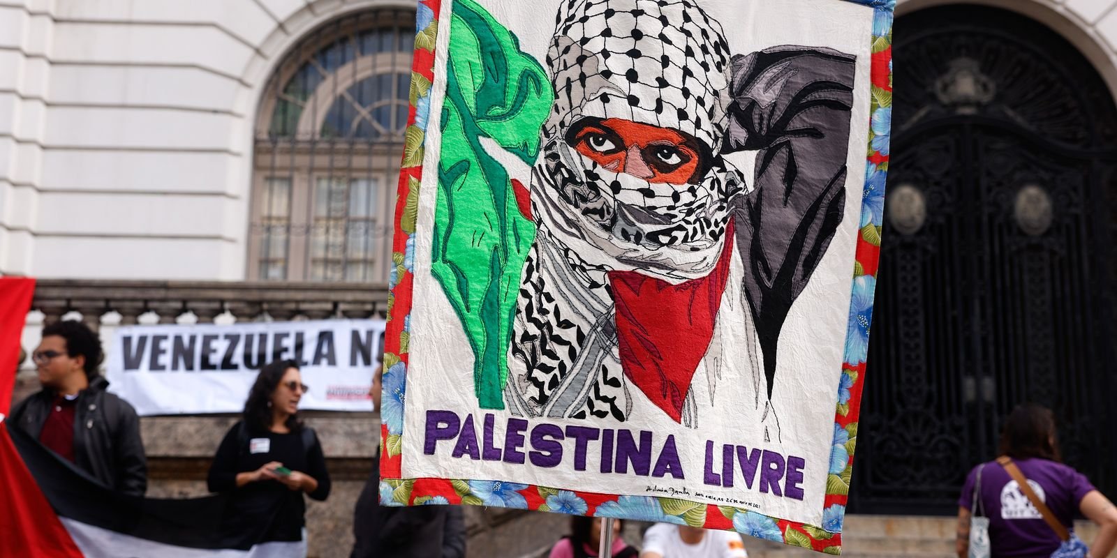 Protesto realizado na tarde desta segunda-feira (7) na Cinelândia, no centro do Rio de Janeiro, pediu o rompimento de relações econômicas, diplomáticas e militares do